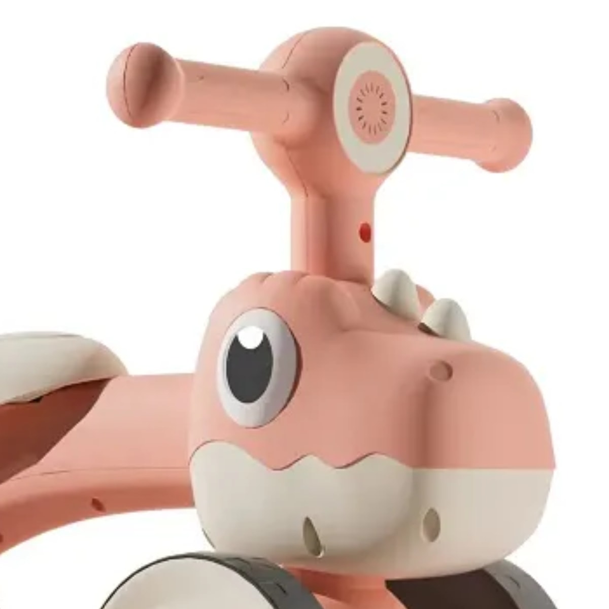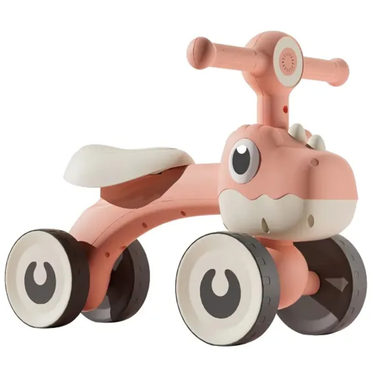 R: Além de ter quatro rodas para maior estabilidade, vem com luz e design em formato de dinossauro, encantando as crianças.