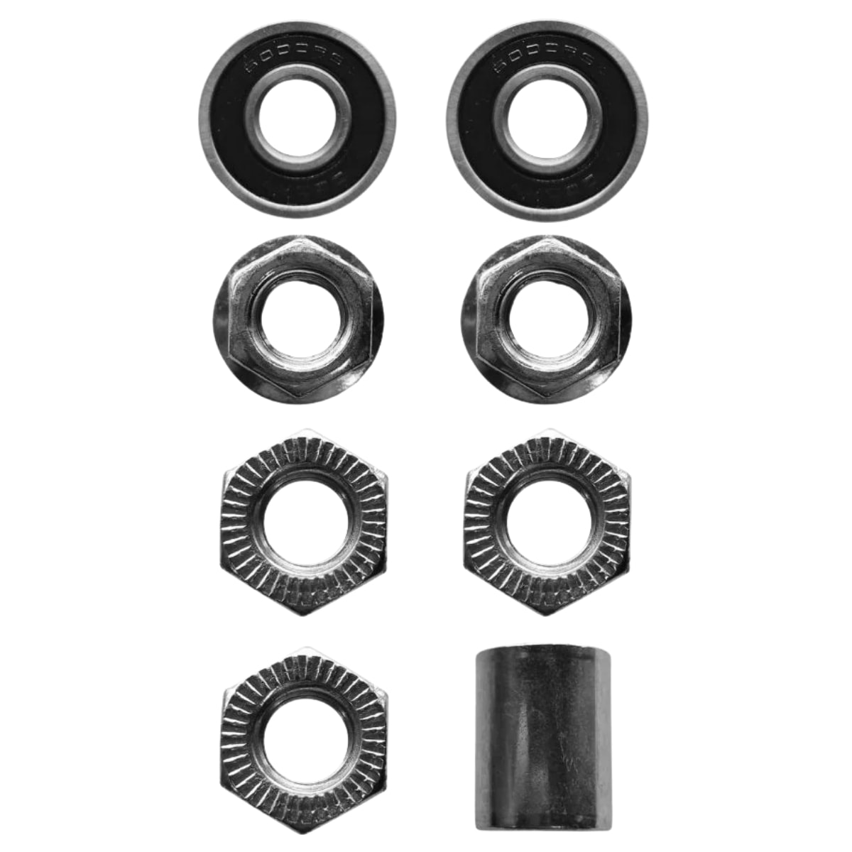 • Componentes: 1 Rolamento 6200RS, 1 Rolamento 6000RS, 3 Contraporcas, 2 Porcas com Flanges, 1 Espaçador