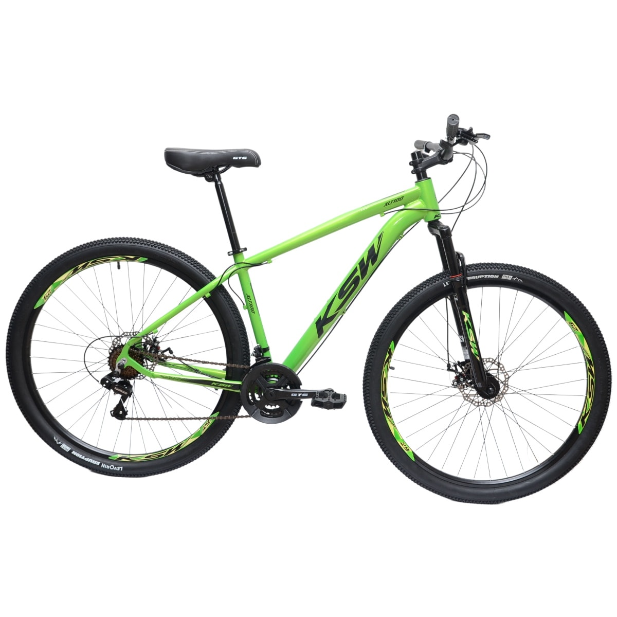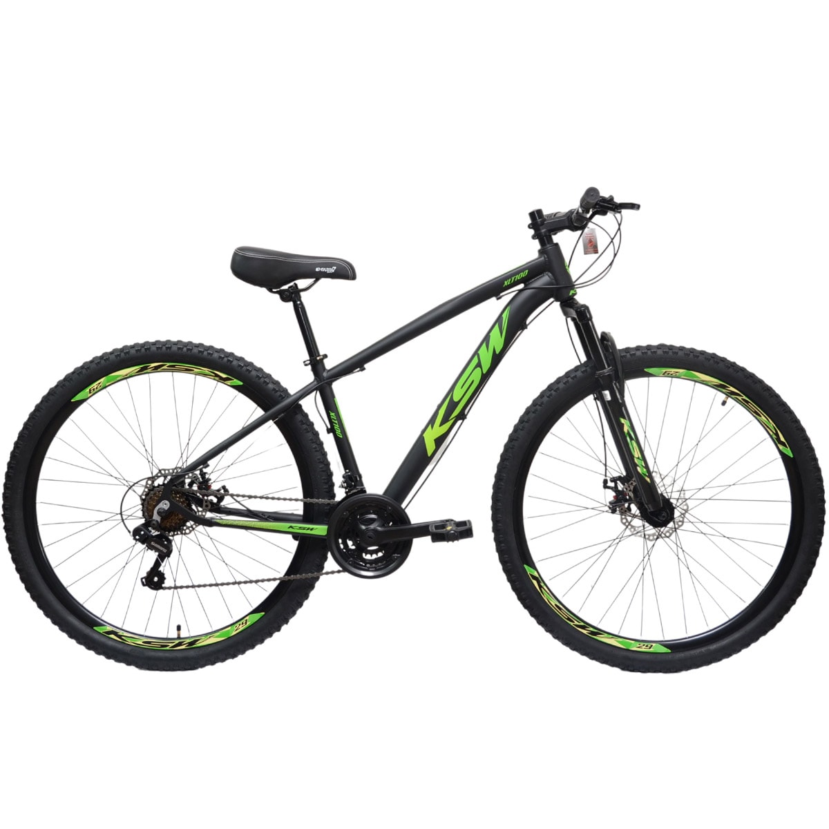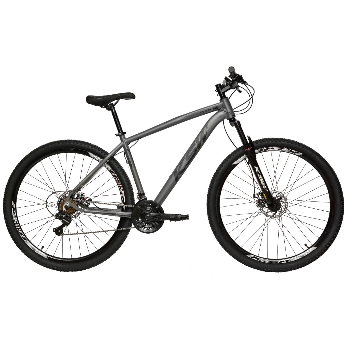 A KSW vem equipada com quadro KSW XLT 100 em alumínio, suspensão dianteira com 100 mm de curso, sistema de 21 velocidades com câmbios Shimano e alavanca Rapid Fire 21V — projetada para trocas de marcha suaves no uso urbano.