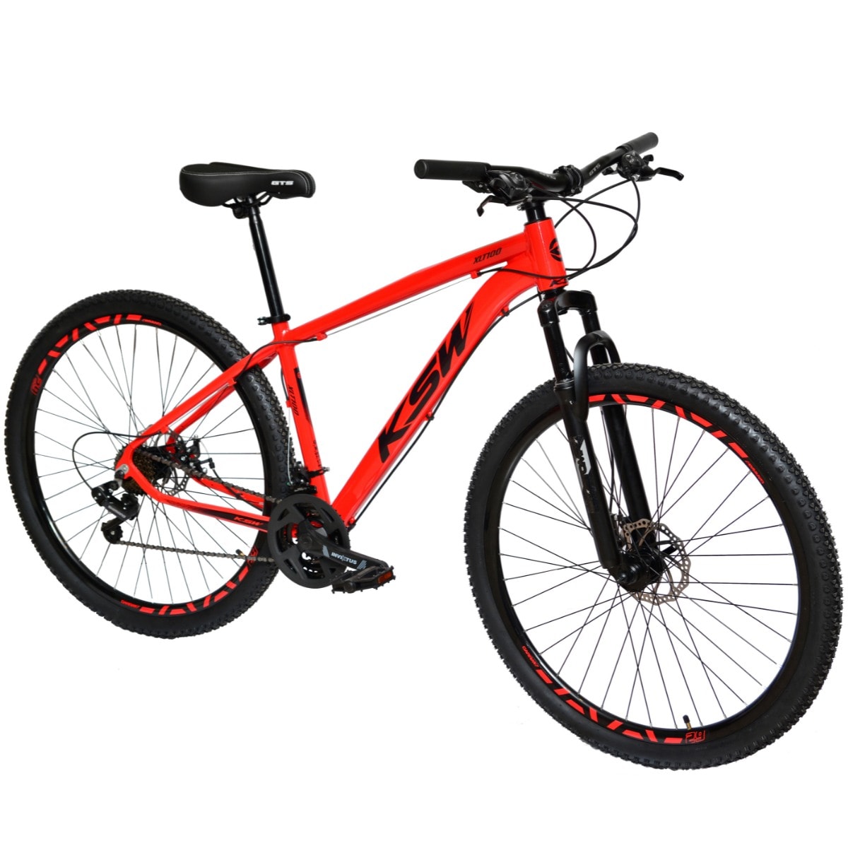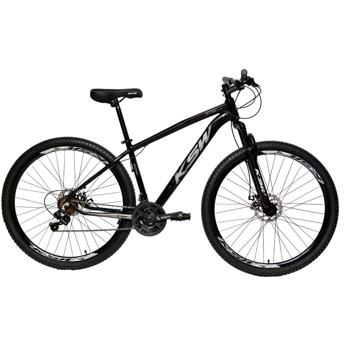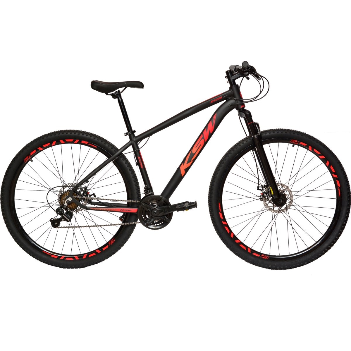 A KSW vem equipada com quadro KSW XLT 100 em alumínio, suspensão dianteira com 100 mm de curso, sistema de 21 velocidades com câmbios Shimano e alavanca Rapid Fire 21V — projetada para trocas de marcha suaves no uso urbano.