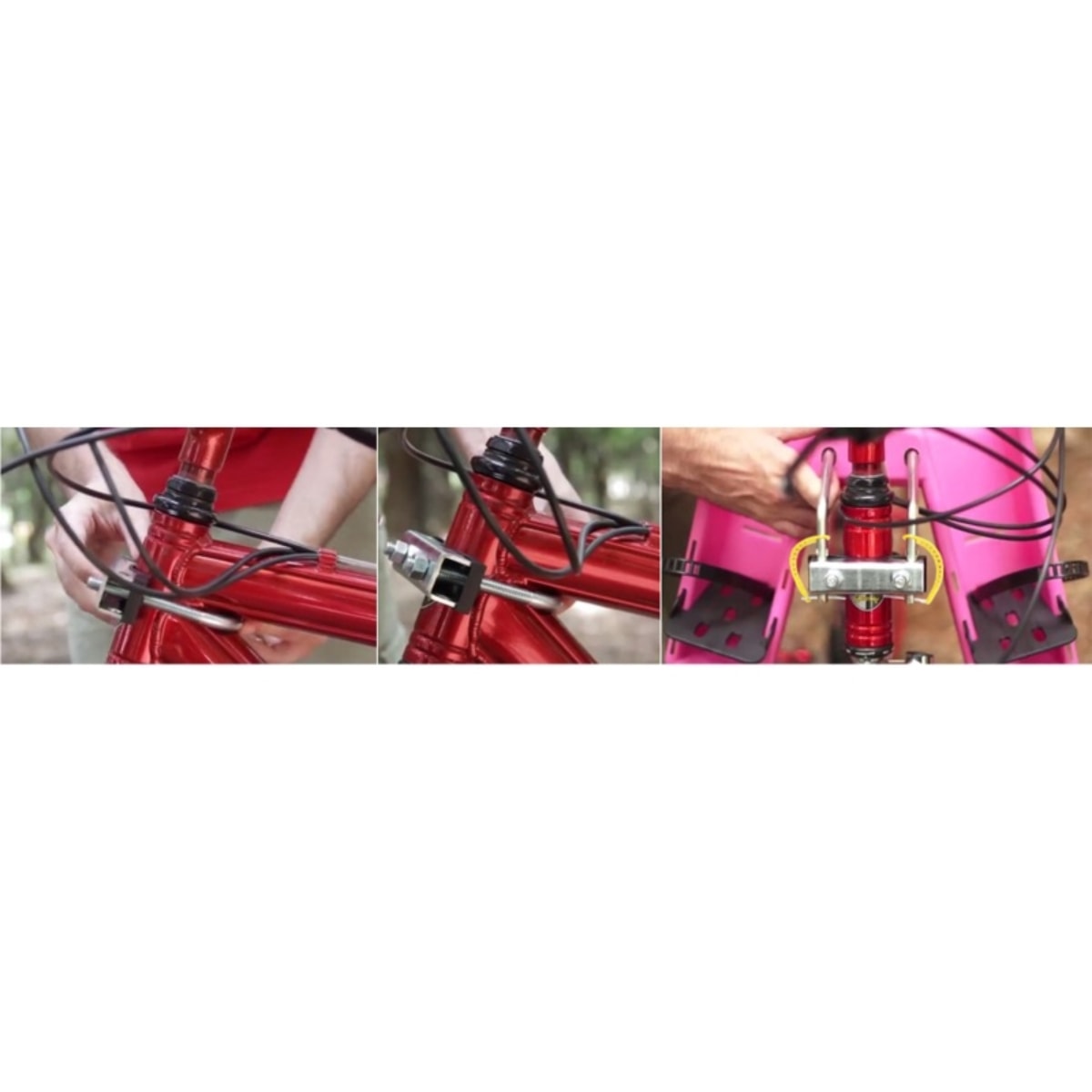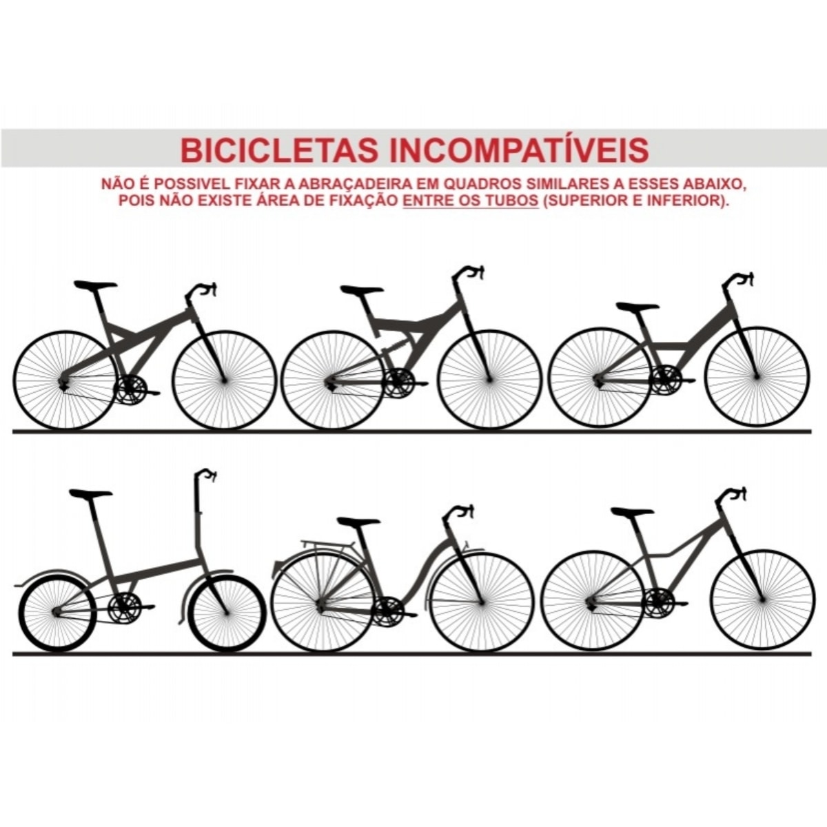 Atenção: Nem todas as bicicletas são compatíveis. Bicicletas com cabeçotes largos, tubos muito próximos, suspensões double crown, guidões voltados para dentro ou quadros de carbono podem exigir adaptação ou impedir a instalação.