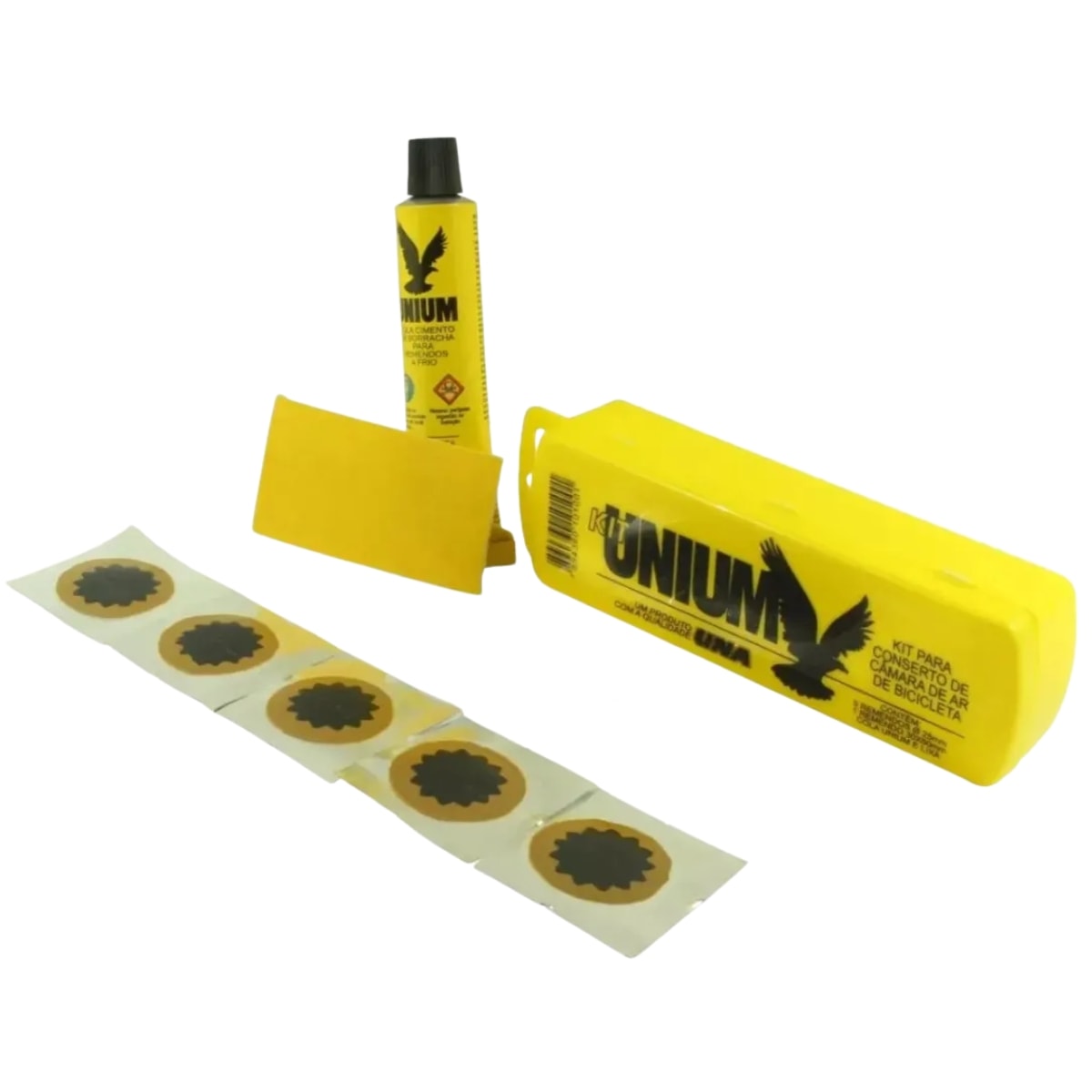 Ter o Kit Unium é ter a tranquilidade de que um pneu furado não será o fim do seu passeio. A cola Unium possui uma fórmula de secagem rápida e vulcanização eficiente, garantindo que o remendo se funda à câmara de ar de forma permanente. O formato estrela dos remendos é compatível com diferentes tamanhos de furos, e a lixa inclusa prepara a superfície perfeitamente para uma colagem resistente. Além de ser muito leve, o estojo organiza os itens e evita que a cola amasse ou fure dentro da sua bolsa de ferramentas.