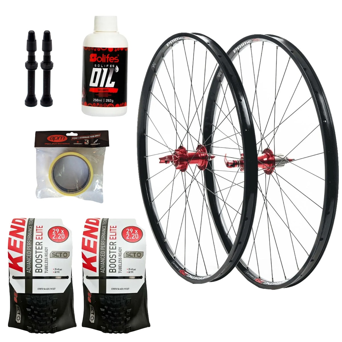 Nesse KIT, além do par de Rodas Absolute PRIME completo, também compõe Par de Pneus Kenda Booster Elite + Válvulas, Selante e Fita apropriado para Tubeless.