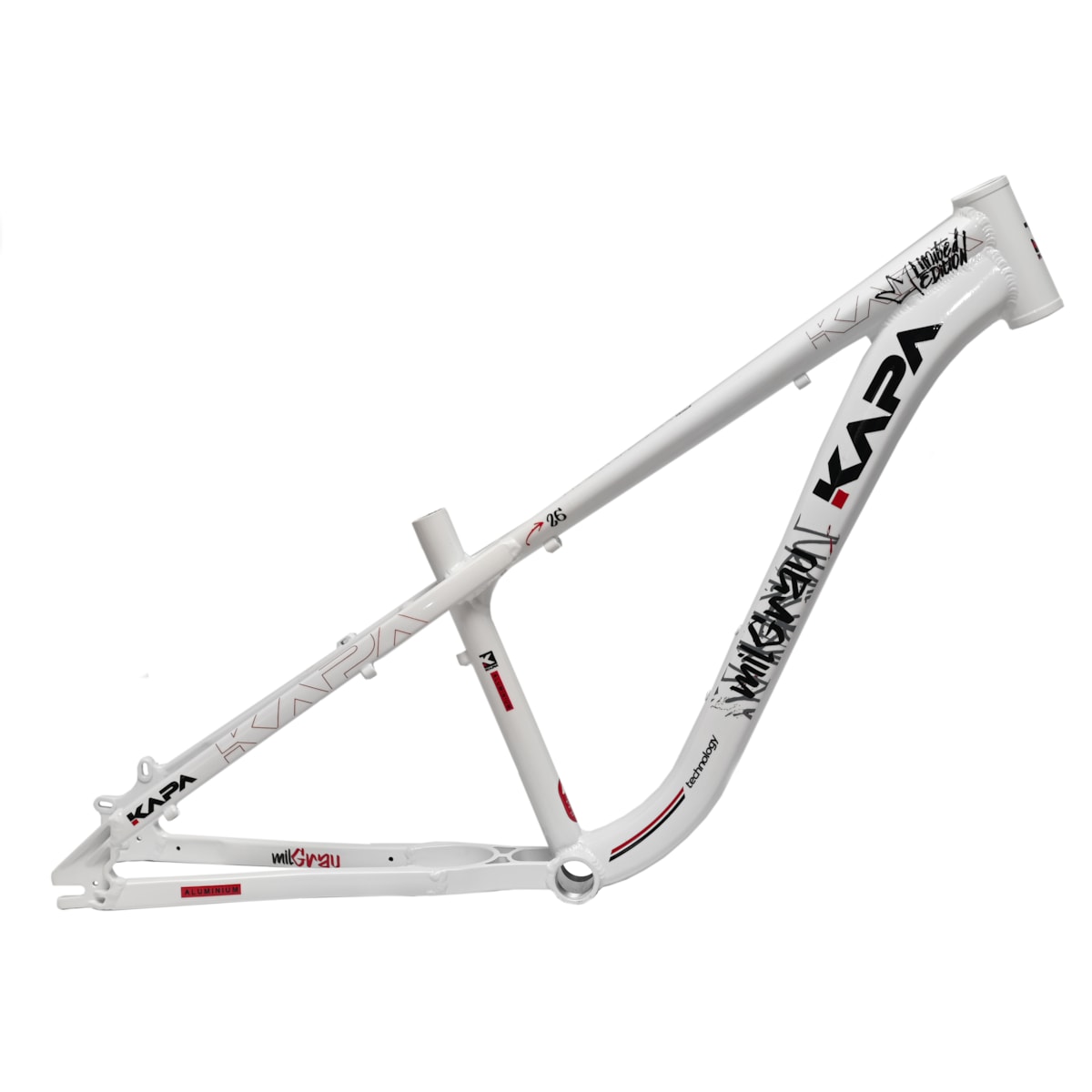 O Quadro Aro 26 Kapa Mil Grau Freeride é o lançamento exclusivo da Loja na Pista, desenvolvido especialmente para quem vive a verdadeira Arte do Grau. Com um design robusto, agressivo e marcante, este quadro rivaliza diretamente com modelos como Hupi Naja e Gios, mas com identidade própria que chama atenção em qualquer rolê. Construído em alumínio leve e resistente, entrega durabilidade e firmeza para manobras radicais sem abrir mão do estilo único que só a Kapa proporciona.